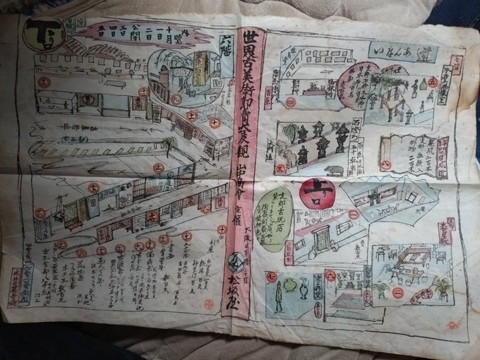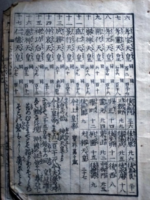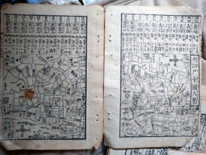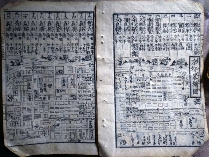 大雑書の小型版の一部がバラバラ入っていた。今上天皇が仁孝天皇と思われる。寛政年間、去年の蔦重の時代に流通していたものか、その再版。京都と大阪の簡略地図は定番で、他の大雑書でも見ます。当時の人の把握する「街の範囲」がわかる。 pic.x.com/HfU2S0Wz0P