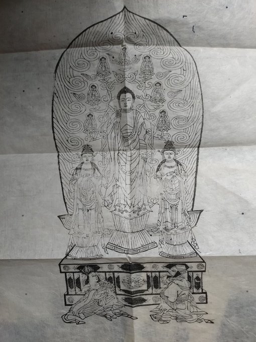 釈迦三尊像と十六善神うち常啼菩薩(女神形)ならびに法涌菩薩の摺物だと思うが、変な分け方をしてるし、どこのものなのかは知らん。 pic.x.com/lyLvn4tiTT